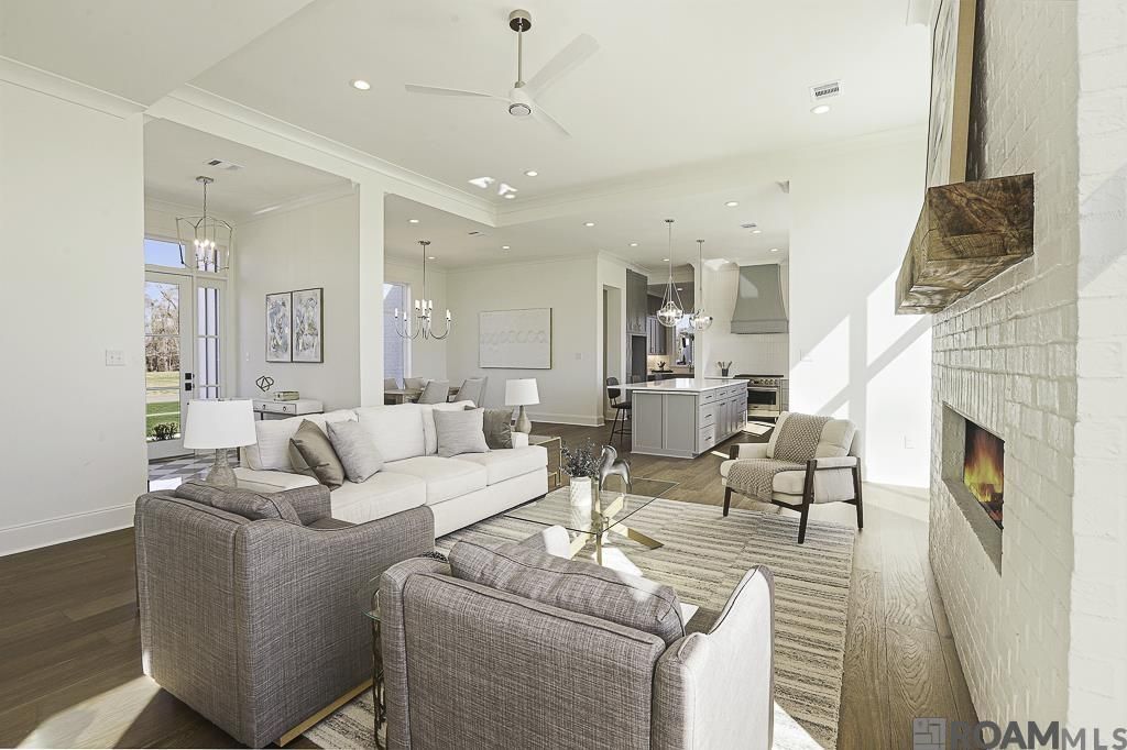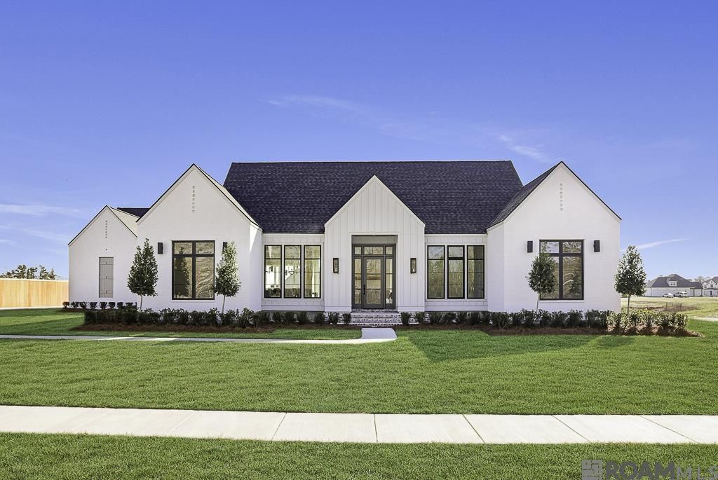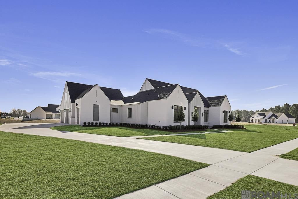 Situated on a premier one-acre waterfront lot in peaceful Hidden Lakes, this brand new construction offers a perfect blend of modern luxury and architectural sophistication with a stunning cool color palette that is timeless and beautiful. This home features a spacious 4BR/3BA triple split floor plan with high-end custom finishes and a seamless open-concept layout. The primary suite is functional, quiet luxury with the oversized walk in closet, gorgeous, fully tiled walk-in shower, freestanding tub set against a beautiful tile accent wall, and double vanities. The home has two additional bedrooms with a bath and a separate, private guest room and bath. The entry is stunning with the checkerboard marble tile floor leading into the main living space, that boasts white oak hardwood floors and a bold brick fireplace and cypress mantle. The kitchen features an impressive, oversized quartz island that calls you to sit and stay a while. Entertaining is a breeze with the large dining area, island bar, oversize outdoor patio and scullery kitchen offering effortless organization and prep, with the additional sink, counterspace and storage galore. Living here just gets better. Enjoy the serene water view from the knockout covered porch, complete with gas grill, sink and fridge, perfect for enjoying the outdoor space. Relax on the quiet front porch while enjoying your morning cup of coffee. All this functional luxury plus a spacious laundry room, two car garage, large storage area and a practical drop zone. Nestled within the top-rated Ascension Parish School System, this signature property provides a rare opportunity for private, upscale living in one of Prairieville's most desirable areas. Close to local amenities! Flood zone X!